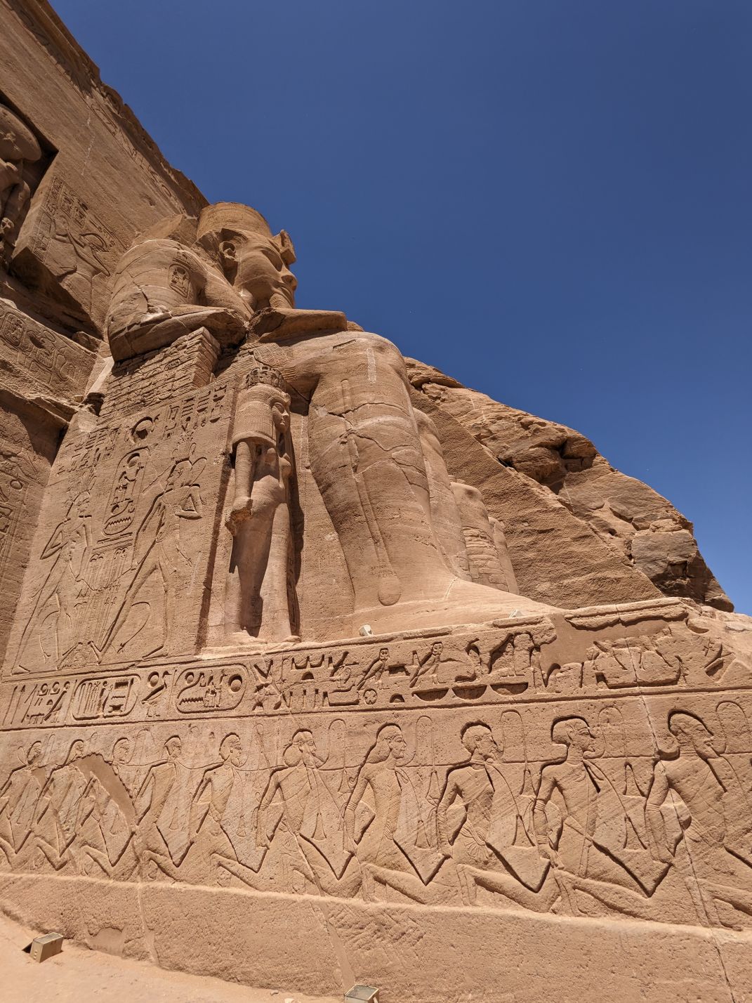 Am nächsten Tag haben wir den Abu Simbel Tempel besichtigt. Die Anreise kann entweder mit dem Minibus (ca. 3,5 Stunden pro Weg) oder mit dem Flugzeug gemacht werden. Da ich die Reise mit dem Minibus im Jahr 2022 bereits gemacht habe, haben wir uns diesmal für den kurzen Flug von 40 Minuten entschieden. Von oben sieht man erst wie gross und verzweigt der Nassersee ist. Die Form des Nassersees hat mich an ein Nervenbild erinnert. Die Besichtigung beim Abu Simbel Tempel beschränkt sich aufgrund des Rückfluges auf ca. zwei Stunden, was jedoch genug Zeit ist. Der Tempel von Abu Simbel musste versetzt werden, weil der Assuan-Staudamm gebaut wurde, der den Nil zu einem riesigen Stausee (dem Nassersee) aufstaute. Dadurch stieg der Wasserspiegel und hätte den Tempel überflutet. Um dieses antike Kulturgut zu retten, wurde der gesamte Tempel um 64 Meter höher gelegt.