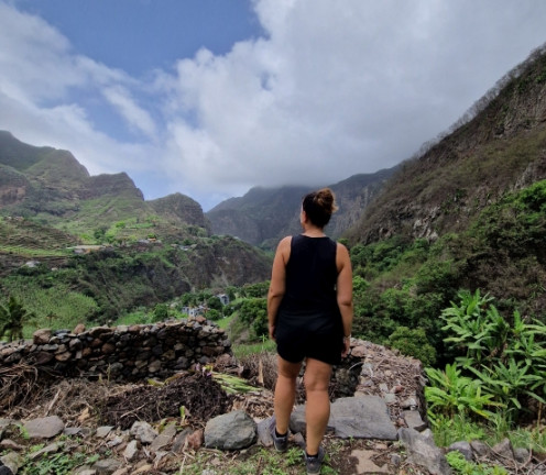 Santo Antão ist für uns beide eine der schönsten Inseln der Kapverden. Obwohl wir beide schon auf der Insel waren, haben wir uns diesmal wieder total verliebt in das Eiland! Früh morgens wurden wir im Hotel in Mindelo (nur ein kurzer Zwischenstopp nach dem Flug von Santiago) abgeholt und fuhren um 07:00 Uhr mit der Fähre nach Porto Novo in die Inselhauptstadt. Dort hat uns unser Fahrer erwartet. Nachdem wir uns mit Wasser und Bananen (die auf Santo Antão sind besonders gut) eingedeckt haben, ging es über die alte Passstrasse hinauf bis zum Cova Krater. Der eingestürzte Vulkan erlosch bereits vor Millionen vor Jahren. Im Kraterboden werden heute Obst und Gemüse angebaut. Das Gebiet ist ideal für Landwirtschaft, da an den Kraterwänden oftmals Pasatwolken hängenbleiben. Nebel und Feuchtigkeit sind keine Seltenheit und sorgen für eine stetige Bewässerung. Da wir in der Regenzeit (August bis Oktober) unterwegs waren, sind wir in den Genuss von Nebel und Nieselregen gekommen. Das hat zwar die Sicht auf den Krater getrübt, uns aber etwas erfrischt bei über 30 C°! Die Weiterfahrt führte uns zur schmalsten Felspassage der Insel: Delgadin. Auch hier war die Aussicht nicht gerade die Beste, wir haben es trotzdem genossen.